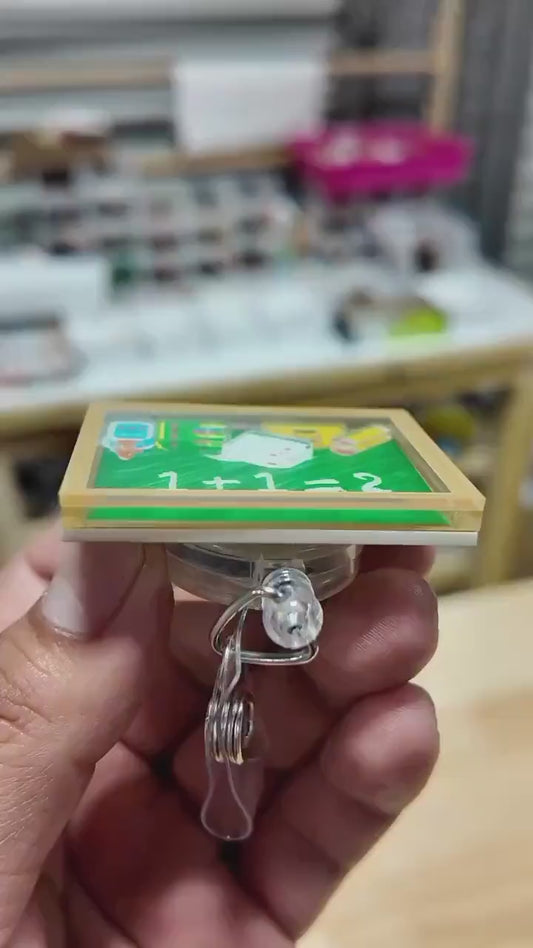 Erase board with school supplies badge reel, teacher ID holder. Shaker badge clip