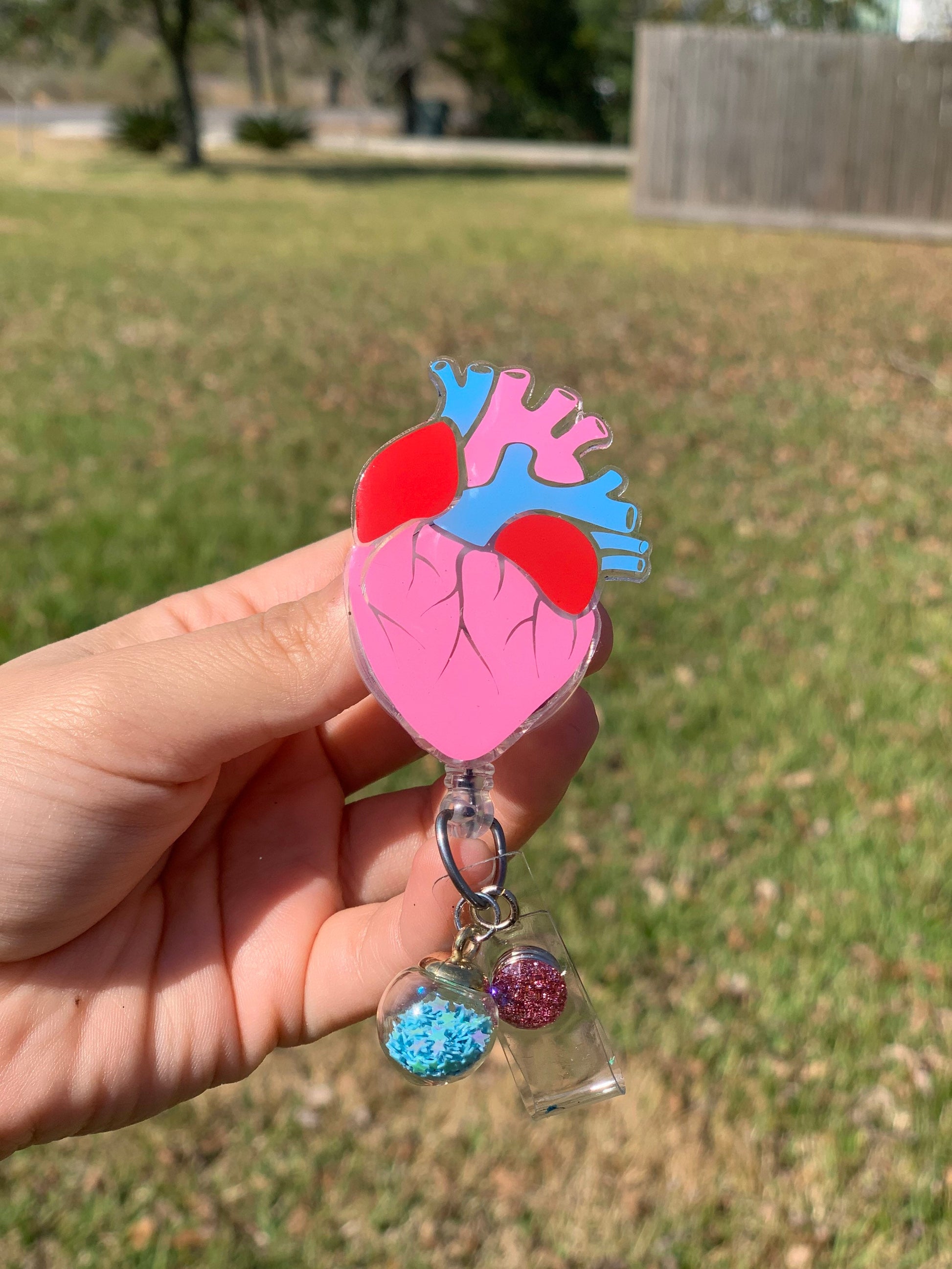 Anatomical Heart shaped Badge Reel. This acrylic retractable badge holder is the best choice for ALL. What a fun accessory to your scrubs, shirt pocket, belt loop, lanyard and more. They make super fun and useful gifts for any person in any profession. A great gift choice for nurses, medical staff, office staff, and anyone who is required to wear a badge!